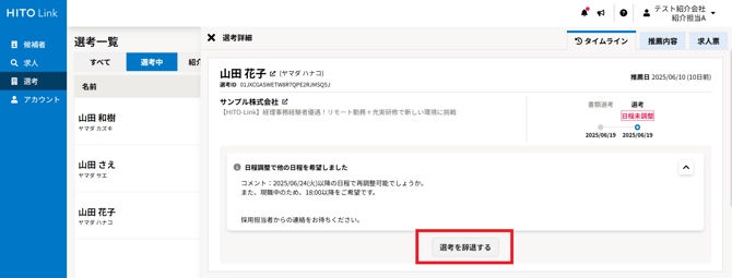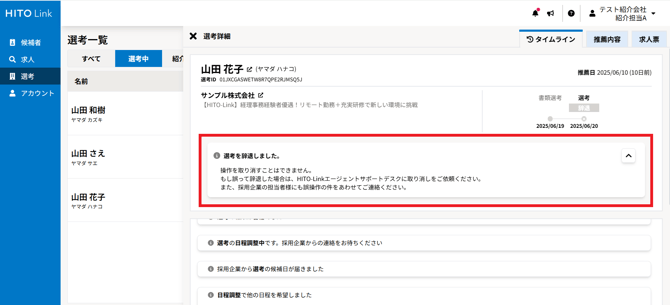 1.サイドメニューから、選考>選考一覧>候補者氏名 をクリックし、辞退する求人の選考詳細画面をひらきます。