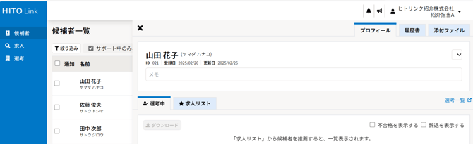 1.サイドメニューの候補者>候補者一覧>候補者氏名をクリックします。