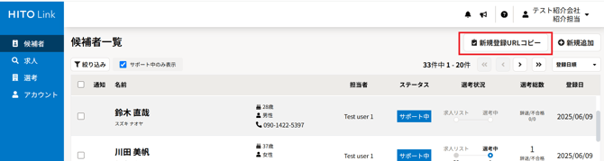 1.サイドメニューの候補者>候補者一覧の〔新規登録URLコピー〕をクリックします。コピーしたURLを候補者へメールで送ります。