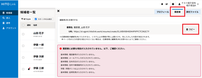 2.履歴書タブをクリックすると、履歴補記入フォームの編集用URLを発行する画面が表示されるので、〔コピー〕をクリックします。コピーしたURLを候補者へメールで送ります。