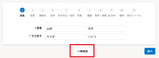 一度に入力しきれない場合は〔一時保存〕をクリックすることも可能です。