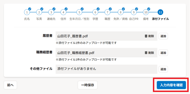 2.履歴書情報をエージェントへ送る場合は、〔入力内容を確認〕をクリックします。