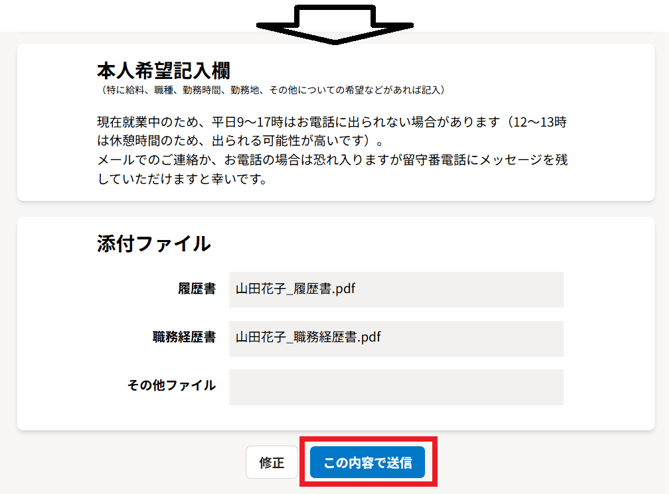 3.入力した内容をすべて確認し、問題なければ〔この内容で送信〕をクリックします。