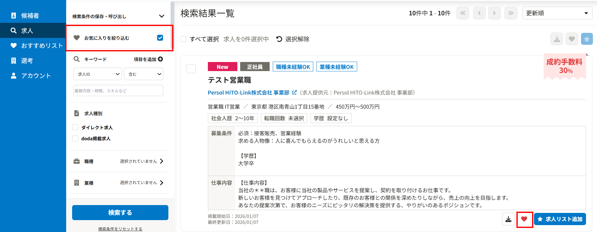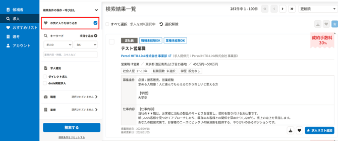 1.サイドメニュー>求人 を開き、検索条件の【お気に入りを絞り込む】にチェックをいれると、お気に入りに追加した求人が表示されます
