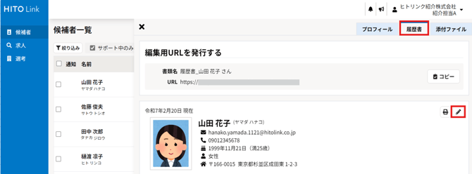 履歴書タブでは、候補者の履歴書内容を確認できます。鉛筆アイコンをクリックすると、編集することもできます。
