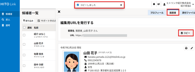 URLの右側の〔コピー〕 をクリックすると履歴書記入フォームの編集用URLを発行をすることができます。コピーしたURLを候補者に送ることで、候補者に登録してもらうこともできます。