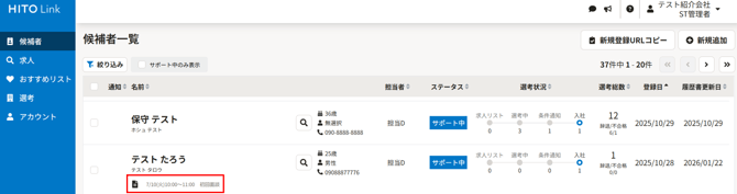 メモ欄に入力した内容は、候補者一覧で氏名の下に表示されるようになります。