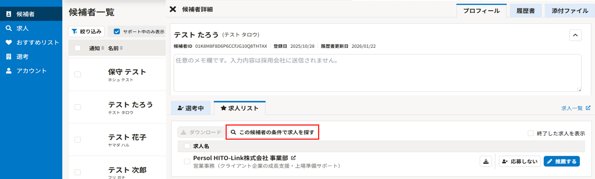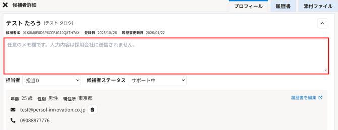 候補者詳細画面では、対象の候補者が選考中の求人を確認したり、求人リストから候補者を推薦することができます。また候補者のステータスを変更することで候補者一覧から非表示にしたり、面談時のメモなどを管理欄に入力することで候補者一覧画面に表示させることができます。履歴書の登録や添付ファイルの管理もこのページでできます。