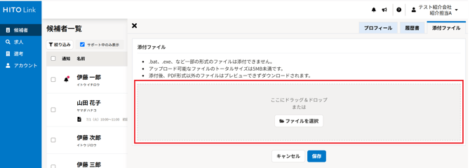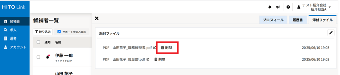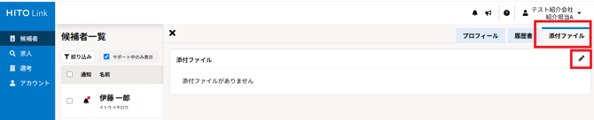 1.サイドメニューの候補者>候補者一覧>候補者氏名 をクリックします。候補者詳細画面がひらくので、添付ファイルのタブをクリック>鉛筆アイコンをクリックします。