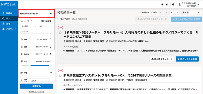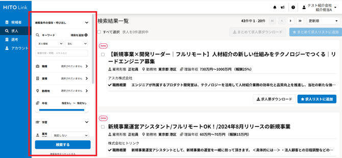 左側に表示されている絞り込み条件を指定して〔検索する〕をクリックすると、条件に一致した求人が一覧に表示されます。