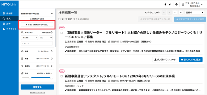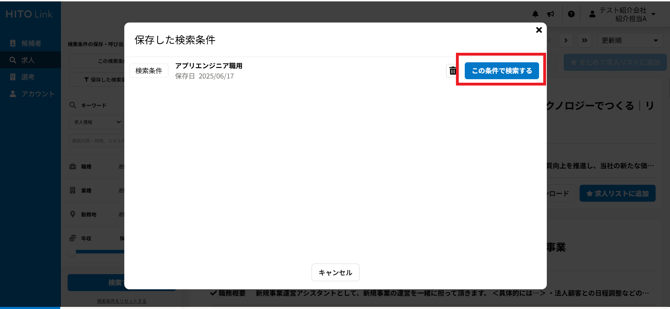 2.保存した検索条件一覧が表示されます。使用したい検索条件の〔この条件で検索する〕をクリックすると、検索条件に一致した求人が一覧に表示されます。