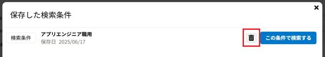 削除したい検索条件の名称上のごみ箱アイコンをクリックすると、検索条件の削除ができます。