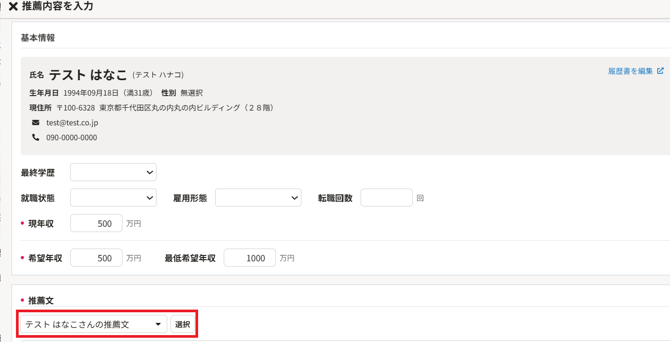 3.候補者詳細>〔推薦文〕をクリック より新規登録もしくは更新をすることで、推薦時に候補者用の推薦文を呼び出すことができます。