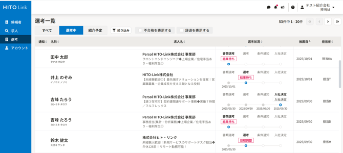 候補者ごとではなく、推薦した求人単位で一覧で表示されるため、選考の進捗を簡単に確認できます。