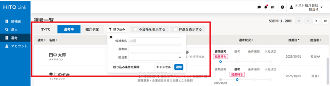 - 〔絞り込み〕では候補者名/選考ID/担当者名で見たい候補者を簡単に探せます。初期では担当者がログインユーザーで絞り込まれています。