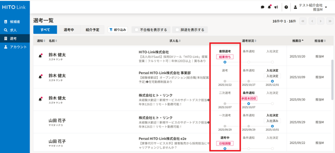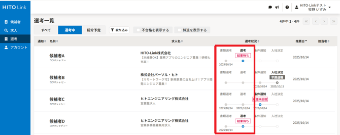 採用企業の設定によっては「選考中」など、ステップ名以外の値で表示されることがあります。ご了承ください。