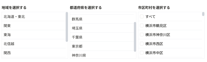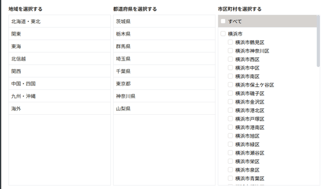 例)神奈川県を選択した後は横浜市○○区までの狭域検索でした。
