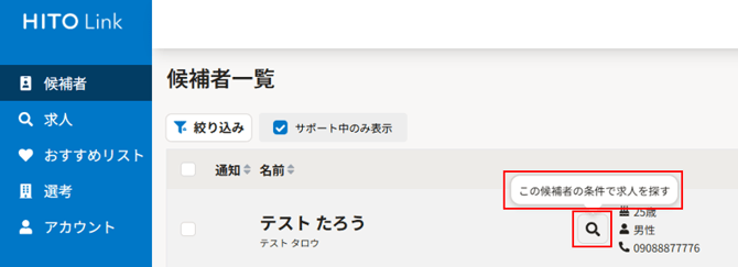 これまでは候補者に沿った条件で求人をワンクリックで探すことができませんでした。今回のリリースで、候補者ごとに🔍マークが追加され、候補者の条件に沿った求人がワンクリック検索できるようになります!