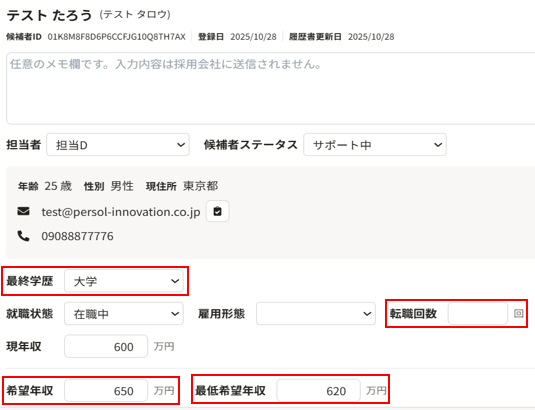 🔍マークを押下すると「候補者詳細」に登録されている最終学歴、転職回数、希望年収、最低希望年収が反映された求人が表示されます。
