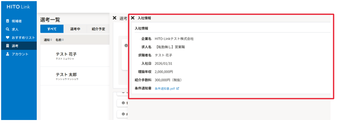 今回のリリースで、内定承諾後、システム上で決定情報を確認することができるようになります。「入社日」、「理論年収」、「紹介手数料」および「条件通知書」など確認することが可能となり、