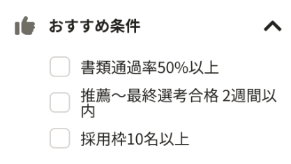 これまでの求人検索画面をバージョンアップし、注力求人を検索できる項目を追加します! 「書類通過率50%以上」、「推薦~最終選考合格 2週間以内」、「採用枠10名以上」の3項目が追加で検索可能となり、注力求人を検索しやすくなります。