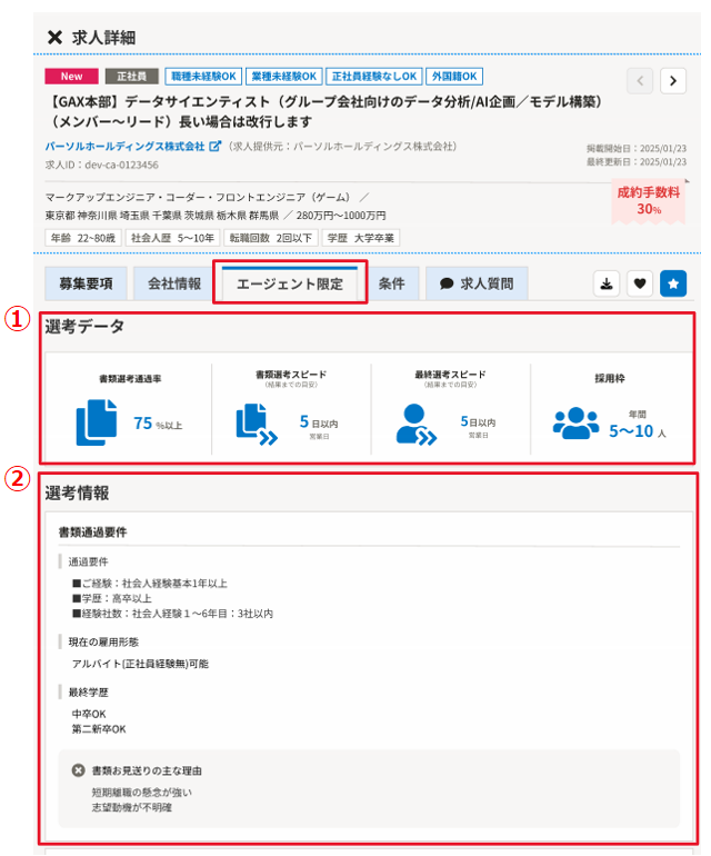 求人詳細の「エージェント限定」タブに、「選考データ」を見やすく表示します!