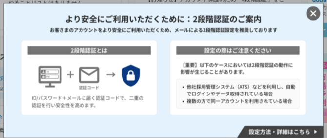 上記ポップアップで案内があるように、dodaログインで2段階認証ができるようになりましたがHITO-Linkと自動連携を行っているアカウントでは、多要素認証設定をオフにしていただく必要がございます。オンになっているアカウントでは取込ができません。ご対応をお願いいたします。