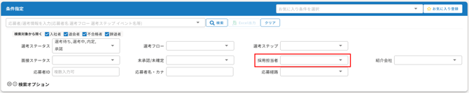 応募者>応募者一覧>条件指定より「採用担当者」で絞り込み検索を行い、応募者の選考状況をご確認ください。