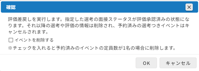 評価差戻しを行う選考ステップ以降の選考や評価は削除され、元に戻すことは出来ません。操作前に必ずご確認ください。