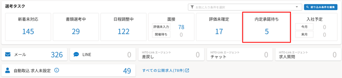 または、ホーム画面の採用タスクにて「内定承諾待ち」の数字をクリックすると、承諾待ちの応募者一覧が表示されます。