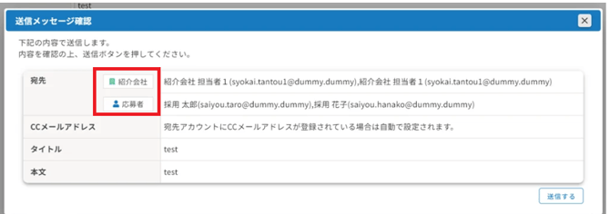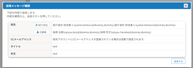 4.〔メール送信〕をクリックすると確認画面が開くので、内容を確認して〔送信する〕をクリックします。送信したメールは、応募者の「メール送受信履歴」タブで確認できます。