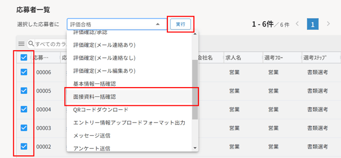 プルダウンより、[面接資料一括確認]を選択、[実行]ボタンをクリックします。