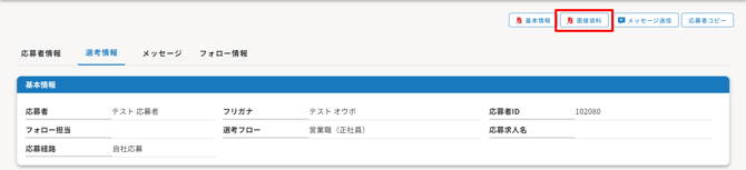 対象の応募者情報画面を表示して〔面接資料〕をクリックします。