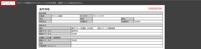 プレビュー画面が開くので、必要に応じて〔ダウンロード〕をクリックしてダウンロードしてください。(チェックした全員分の面接資料が、1つのPDFファイルとして保存されます。)