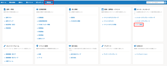 1.メインメニュー>設定>設定一覧>メール署名をひらきます。