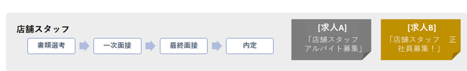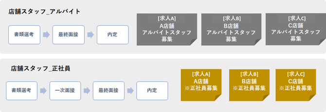 ▼店舗スタッフのなかでアルバイト・正社員ともに選考フローが同じであれば、1つの選考フロー「店舗スタッフ」を使用して、求人情報で募集管理する