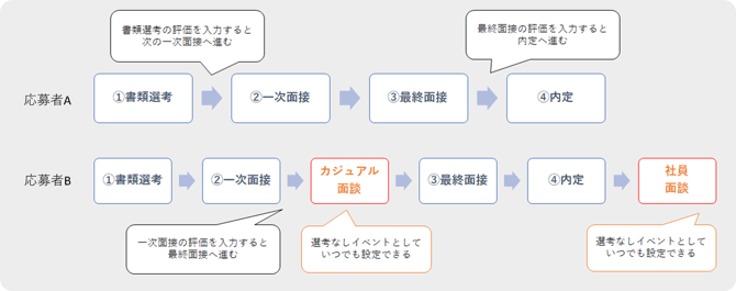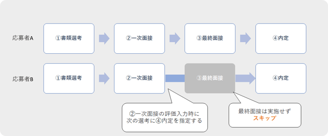 応募者A,Bともに同じ職種(選考フロー)に応募したが、応募者Aはすべての選考プロセスを実施、応募者Bは一次面接のあと最終面接を実施せず、そのまま内定に進むことができる