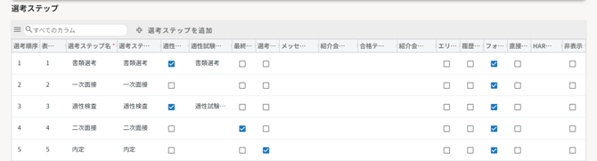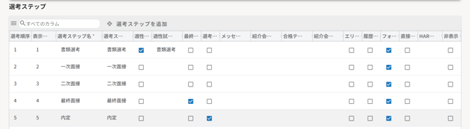 各選考フローに紐づく選考プロセスを「選考ステップ」として設定します。