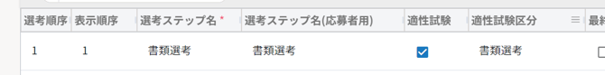 書類選考ステップを登録する場合は「適性試験項目」にチェックをつけて、「適性試験区分」から”書類選考”を選択してください。