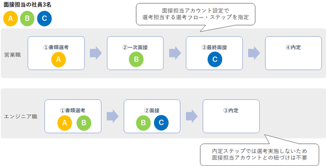 面接官がどの選考を担当するか、アカウント設定で選考フロー/選考ステップを紐づけることで管理できます。