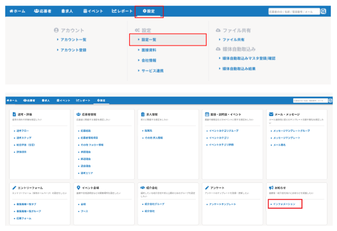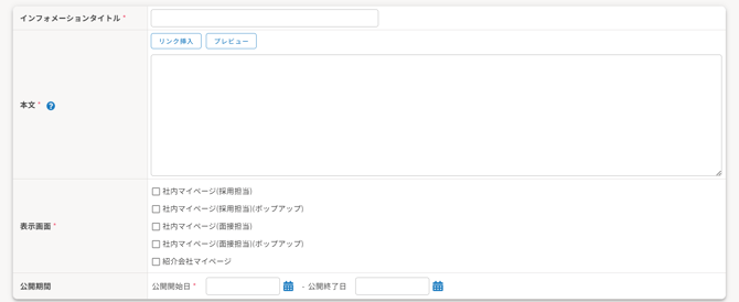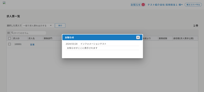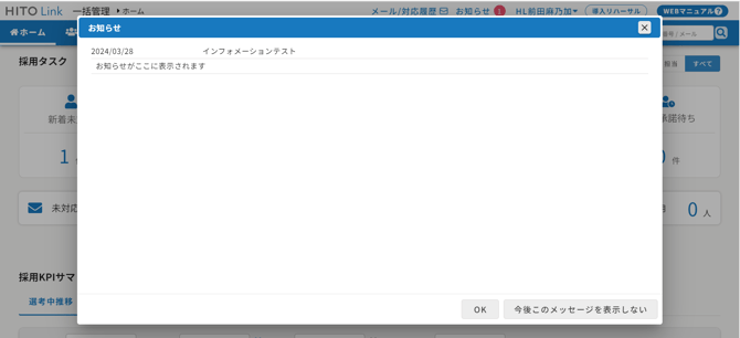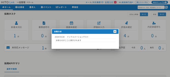 インフォメーションを登録すると面接官や紹介会社のHITO-Linkマイページ上にお知らせを掲載することができます。インフォメーションで登録したものは、システムからのお知らせとして各画面上に掲載されます。