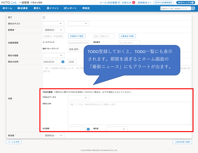 紹介会社や応募者からの問合せを履歴として残すことができます。RPO(採用代行)などを利用している場合、オペレーターのログ管理として利用することもできます。