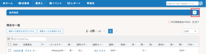 ②一覧画面で条件指定をして検索できます。条件指定は右上の【+】をクリックすると表示されます。