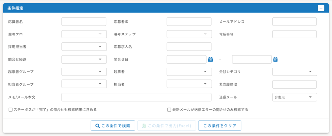 - 画面初期表示時は、迷惑メールの可能性があるものを非表示にしています。迷惑メールを確認したい場合は【迷惑メール】を空欄(すべてのメールを表示)もしくは迷惑メールのみ表示を選択してから検索してください