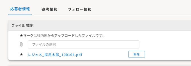 ▼応募時にアップロードされたファイルは応募者情報>ファイル管理より確認できます。