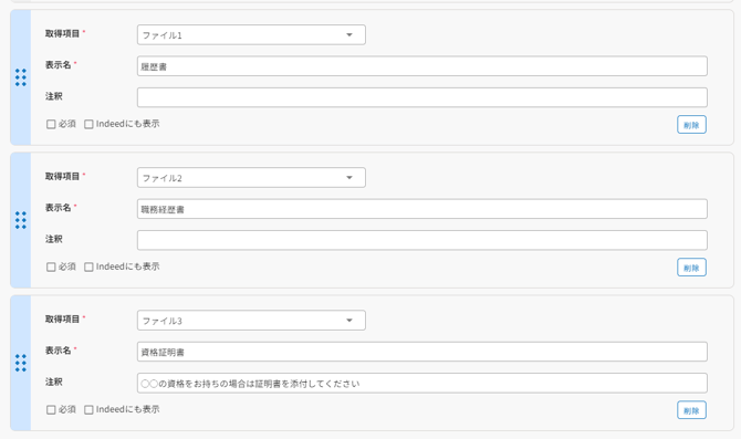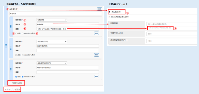 | ③表示名(必須) | 応募フォーム上での項目名を設定します。 |