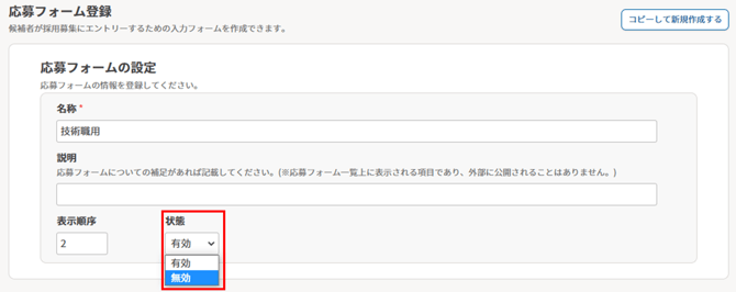 | 状態 | 無効にすると、求人登録>エントリーフォーム設定>応募フォームで選択できなくなります |