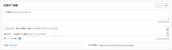 | 本文(必須) | 応募完了画面の本文を入力します |