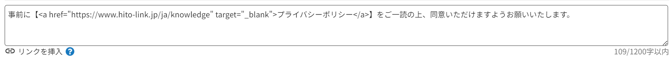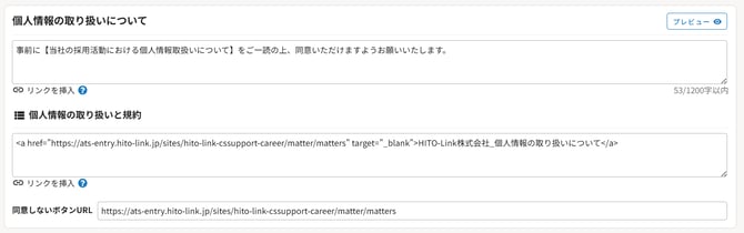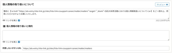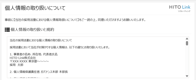 「個人情報規約同意画面」の規約文掲載方法は以下2つのパターンからお選びいただけます。 パターン1:規約文を同意ページ内に掲載する パターン2:規約文をリンクで掲載する |