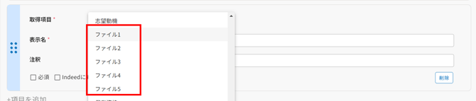 項目の「取得項目」欄でファイル1~5を選択するとファイルアップロード枠が作成できます。